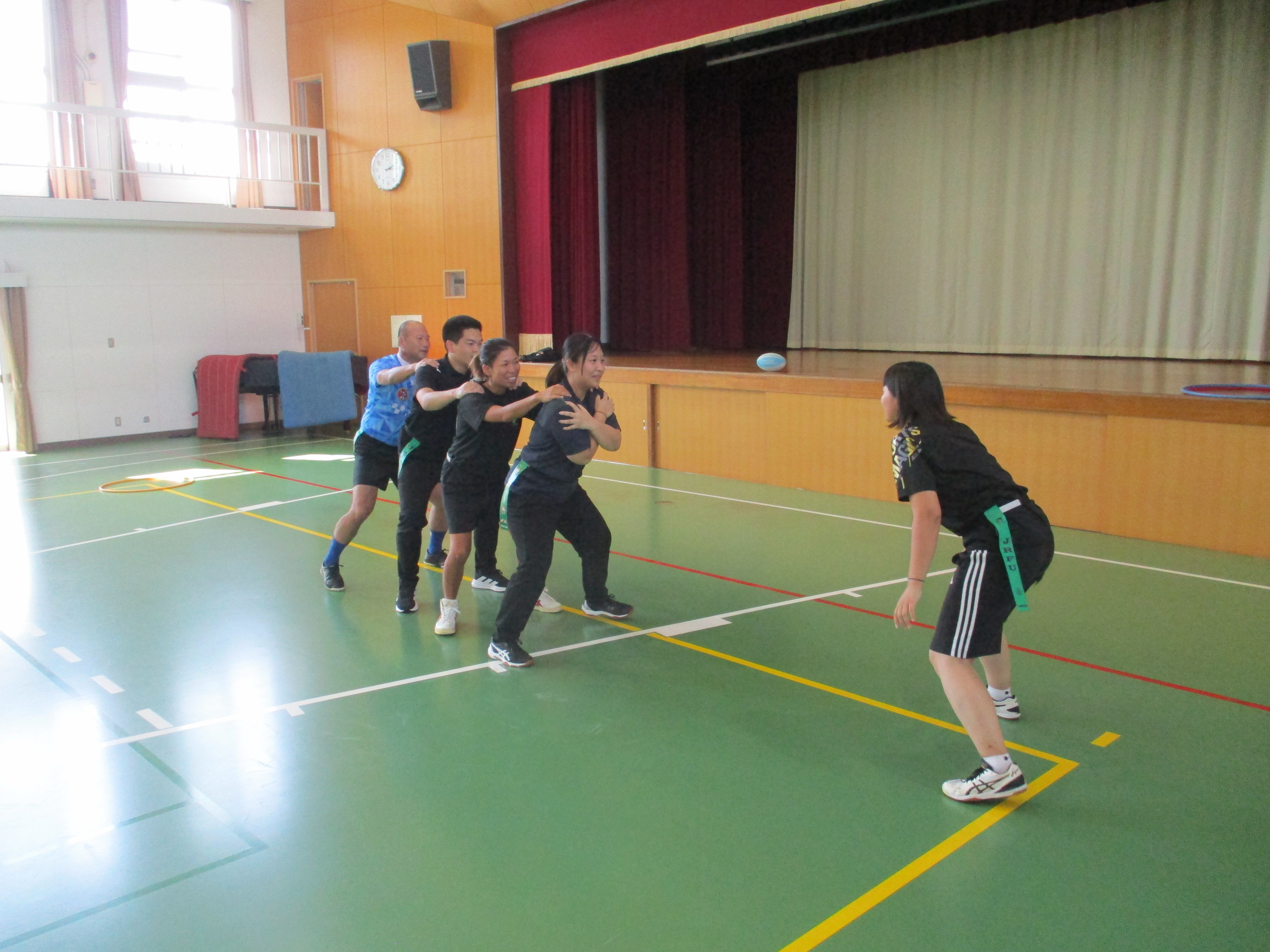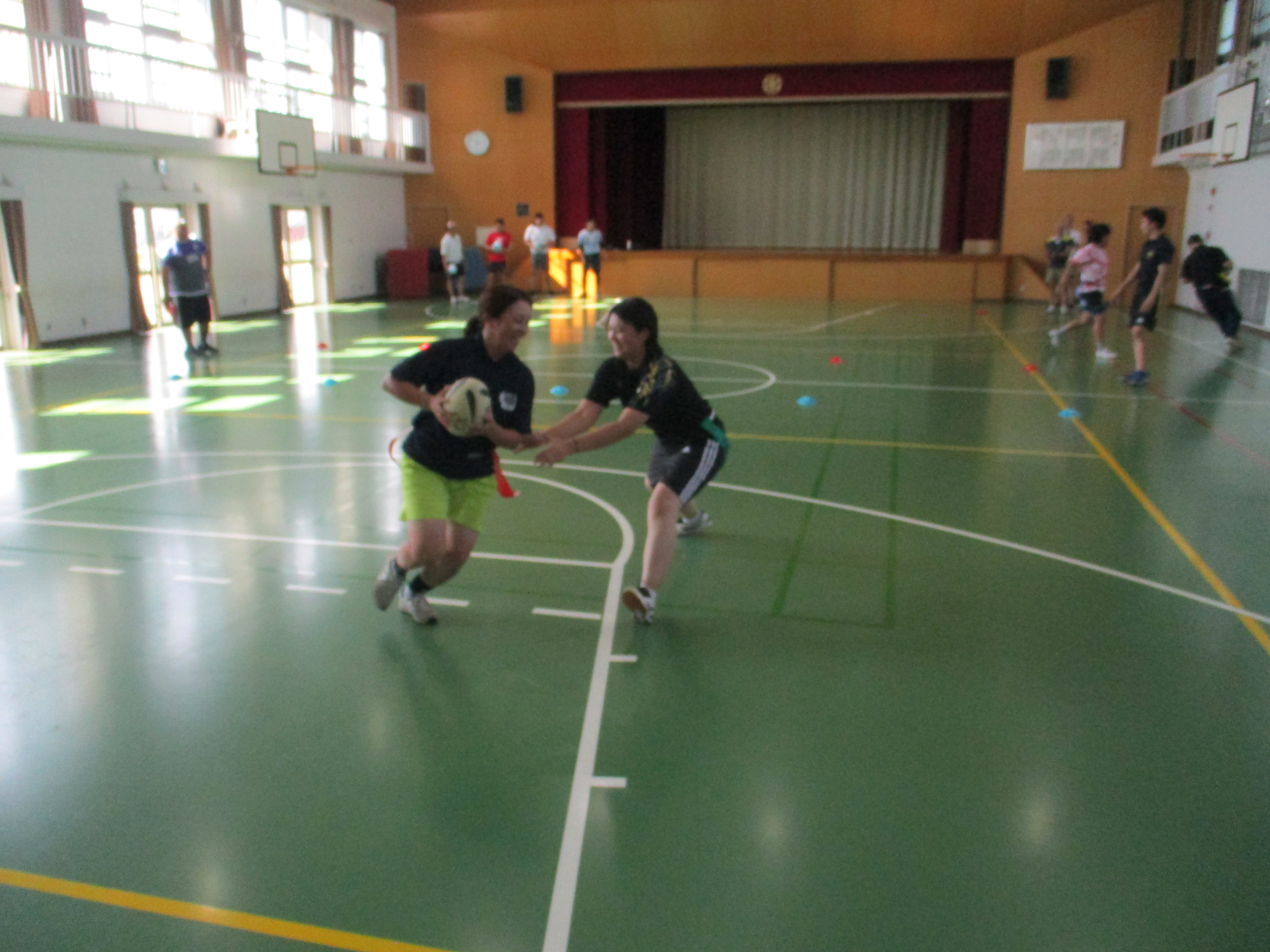 実技では、小学校中学年や高学年の授業の内容を基本としながら、低学年でも使えるタグやラグビーボールを使った運動遊びも紹介しながら研修を進めました。練習やゲームを進める中で、子どもたちへの言葉掛けのタイミングを意識できるようにしたり、コートの広さやボールの数、待機場所や並び方等、なぜそうするのか理由を話したりすることで、状況によって指導内容を工夫し応用することができるようにしました。