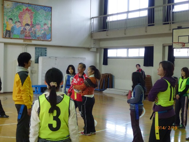 今回の研修会は、同校の「教員研修」を兼ねて開催され、川又校長先生を含め全員の先生方が放課後の忙しい時間帯に体育館に集まり、前半の講義では、「小学校の体育学習におけるタグラグビーの可能性」のタイトルで、(1)ボールゲームの授業をめぐるひとつの問題、(2)問題の解決へ向けた2つの取り組み、(3)学習指導要領との関係について、(4)タグラグビーの魅力と題して講義を行い、タグラグビーの体育授業における優位性等を理解していただきました。