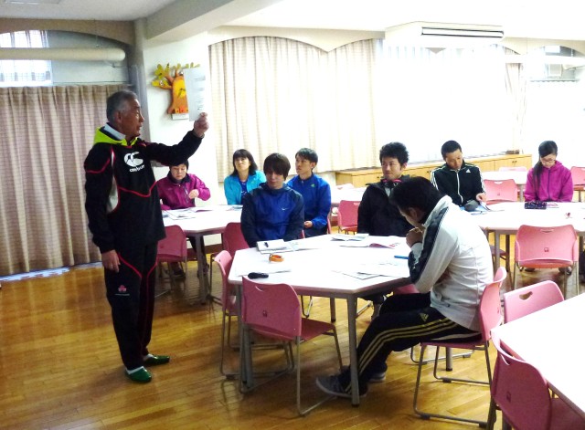 引き続き後半の実技指導は体育館に場所を移し、「小学校におけるタグラグビーの指導方法」とのタイトルで、(1)準備運動としての遊び(低学年で扱う運動遊びを含む)、(2)やさしいルールのゲームとその指導法、(3)発展したルールのゲームとその指導法、(4)攻め方と守り方の作戦例と題して、基本となる2人1組のタグの取り合いと、大きな声で「タグ」の発声練習、タグ取り鬼ごっこ、金魚の糞に見立てたホローの練習、サークルを作ってパスの練習、桃太郎と鬼が島の合戦と名付けた、ボールを持って走り鬼が島の鬼を交わすゲーム等のタグラグビーのゲーム・試合を行ううえでの基本を学んだ所で、歩くスピート・タグ無制限での試合・指導からスタートし、徐々にスピードを上げタグの回数も数え、本格的な試合を体験していただいた所で、本日の実技指導は修了。