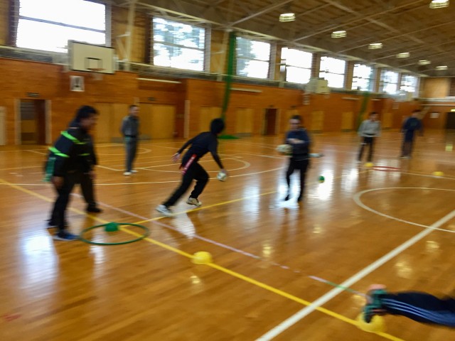 後半、体育館へ移動しての実技指導では、実際に子供達に接して指導する立場からの色々なスキルに関して「小学校におけるタグラグビーの指導方法」とのタイトルで、(1)準備運動としての遊び(低学年で扱う運動遊びを含む)、(2)やさしいルールのゲームとその指導法、(3)発展したルールのゲームとその指導法、(4)攻め方と守り方の作戦例と題して、基本となる2人1組のタグの取り合いと、大きな声で「タグ」の発声練習、タグ取り鬼ごっこ、パスの練習、一対一でボールを持って走る・タグの取り合い等のタグラグビーのゲーム・試合を行ううえでの基本を学んでいただき、最後に3チームに分かれ、歩きからスタートし、早歩き、走りと徐々にスピードを上げた模擬試合を行い、全員が大汗をかき実技指導を無事終了致しました。